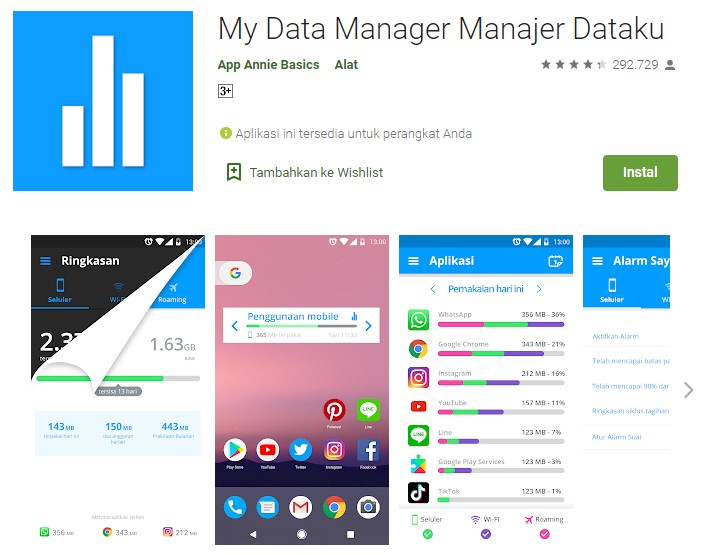 Pilihan aplikasi untuk menghemat kuota internet yakni bernama My Data Manager Manajer Dataku. Aplikasi yang dikembangkan oleh App Annie Basics ini sudah diunduh lebih dari 10 juta kali di Google Playstore. Membuktikan kalau aplikasi ini benar-benar efektif untuk menghemat kuota internet.