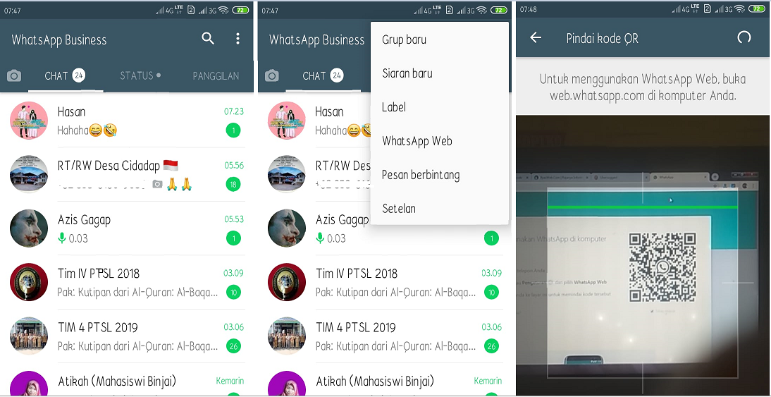- Jika kamu ingin melakukan pemindaian, silakan buka aplikasi Whatsapp, kemudian buka opsi menu (ikon garis tiga) di bagian kanan atas, lalu pilih opsi Whatsapp Web.