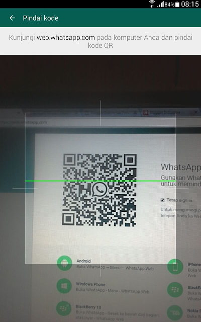 • Sekarang silakan arahkan kotak scanner yang ada di aplikasi WhatsApp tersebut ke gambar Barcode yang ada di situs web.whatsapp pada PC Anda.