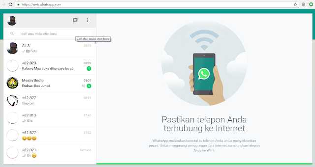 • Jika anda sukses men-scan barcode, maka dalam beberapa saat  tampilan web.whatsapp akan berubah menjadi seperti pada gambar dibawah ini.