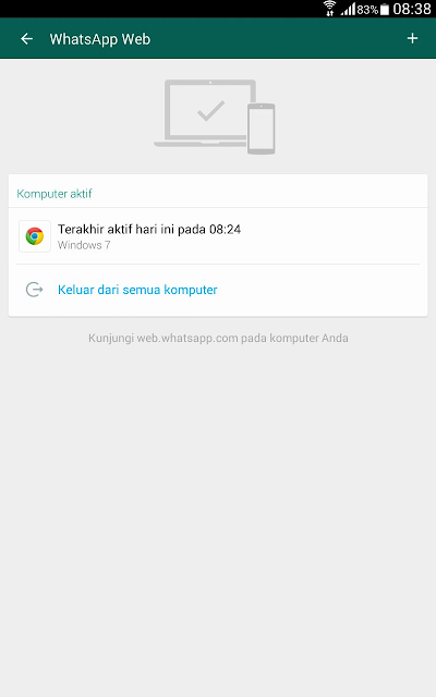 Sedangkan untuk mengetahui ciri – ciri aplikasi WhatsApp Web terhubung dengan internet adalah dengan cara melihat pada menu WhatsApp Web di ponsel target. Jika saja yang muncul bukan scanner barkode melainkan tampilan seperti pada gambar dibawah ini artinya WhatsApp Web sudah dapat digunakan pada perangkat PC Anda.