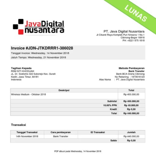 Hal yang membedakan contoh invoice pelunasan ini dengan invoice yang lain adalah adanya stempel bertuliskan “LUNAS” pada selebaran invoice.