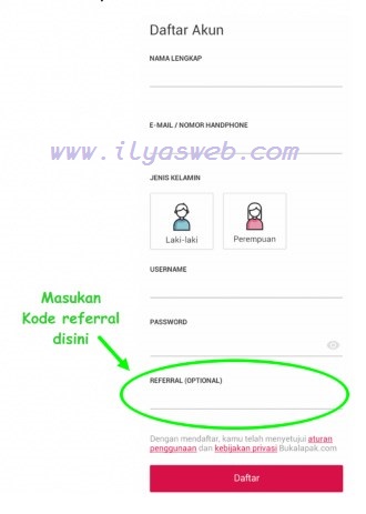 - Silakan isi formulir itu dengan data diri kamu yang sesuai dengan identitas asli kamu, sementara untuk kode referral silakan masukkan yvB7LOlVl3 (kode ref bukalapak milik admin Ilyasweb).